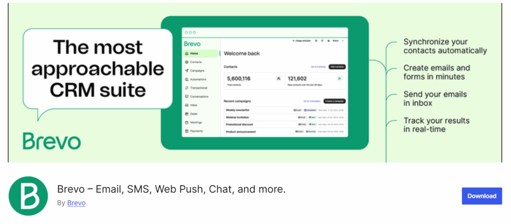 Brevo is an omnichannel marketing and CRM platform that also offers a WordPress plugin to automate communication and manage contacts seamlessly. You can use it to trigger emails and WhatsApp messages when a new WordPress post goes live, sync contacts in real time, and track user activity to understand how visitors interact with your site.
