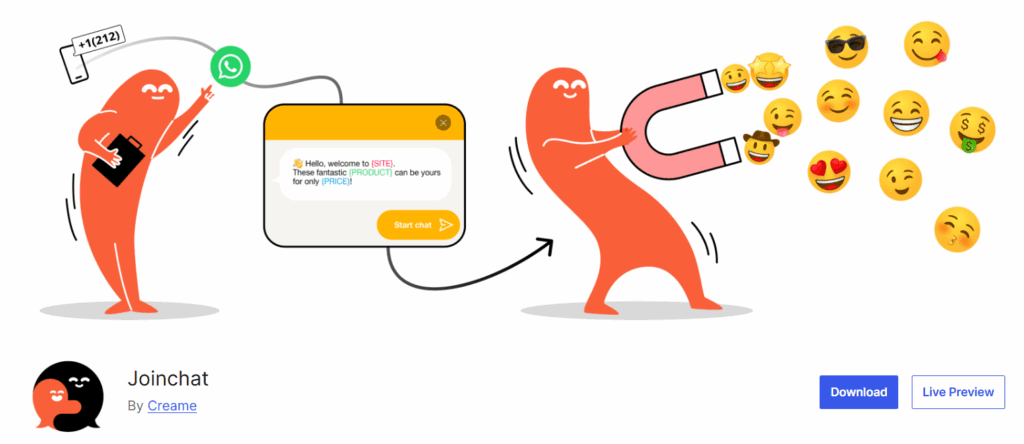 Join.chat is a popular WhatsApp plugin that lets you add a floating button to your website. When someone clicks it, Join.chat automatically opens WhatsApp on their phone, or launches WhatsApp Web or the WhatsApp desktop app on their PC.