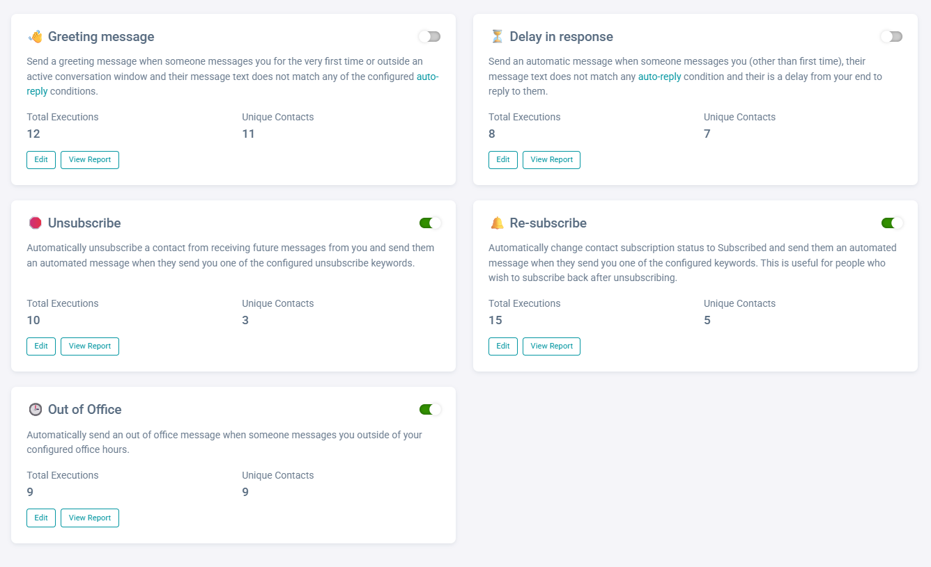 Basic automations enable you to automate greetings, out-of-office, and delay-in-response messages. You can also set up keywords that let contacts unsubscribe or resubscribe to your messaging lists.