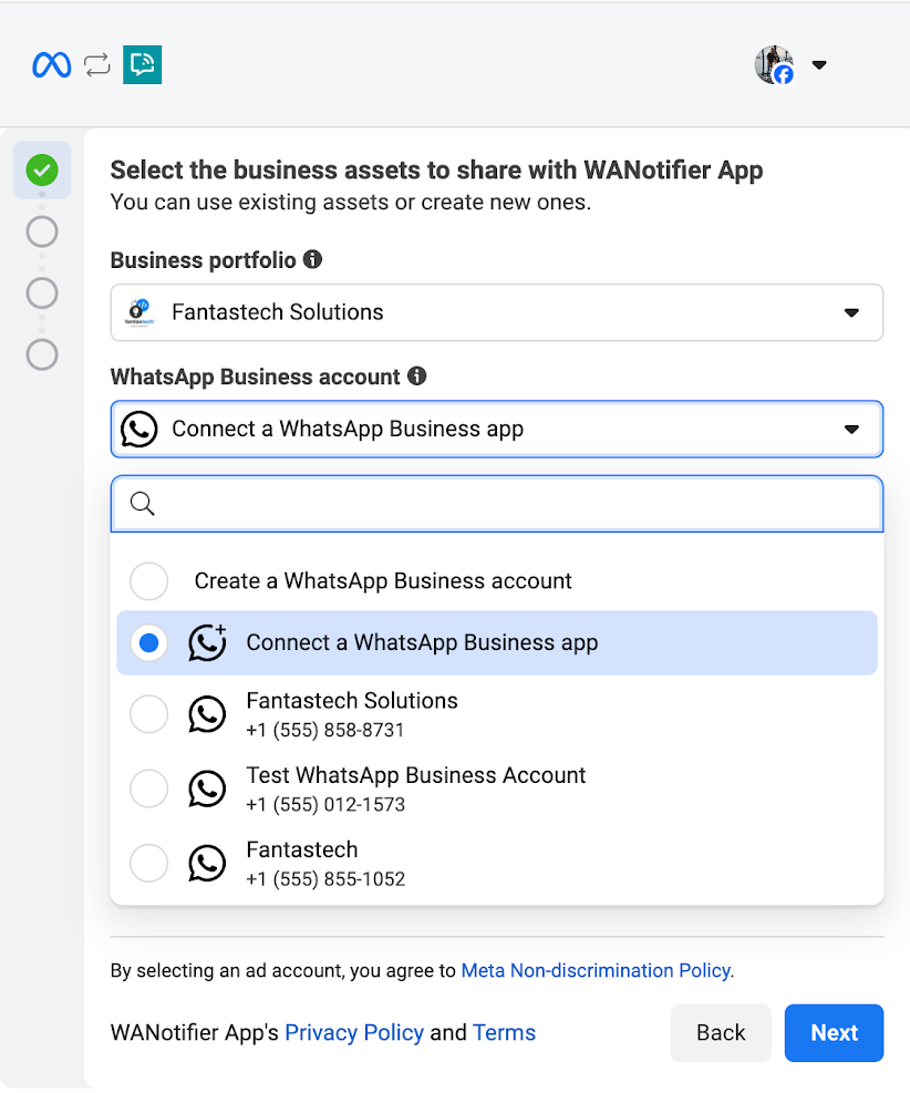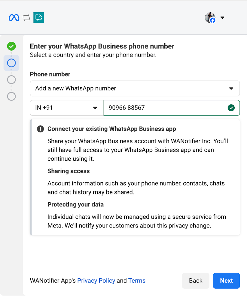 When you go through the Embedded Signup process for adding your phone number with your solution provider, like WANotifier, you’ll see an option to connect your existing WhatsApp Business App account to the WhatsApp API.