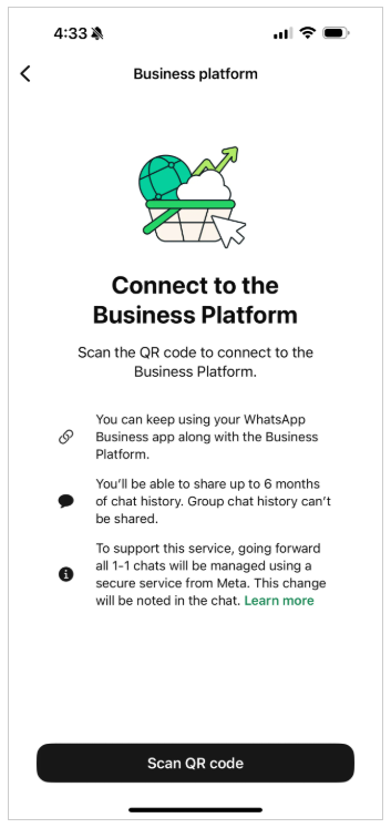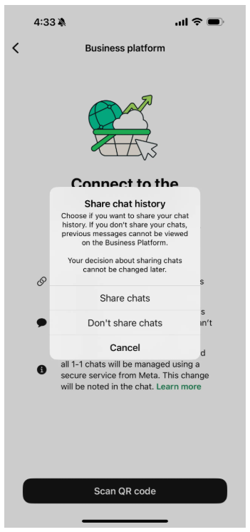 On this screen, tap the Scan QR code button. This will open a pop-up where you’ll get the option to share your previous messages and chats on the Business Platform. Note that if you select the Share chats option, you won’t be able to change this setting later.