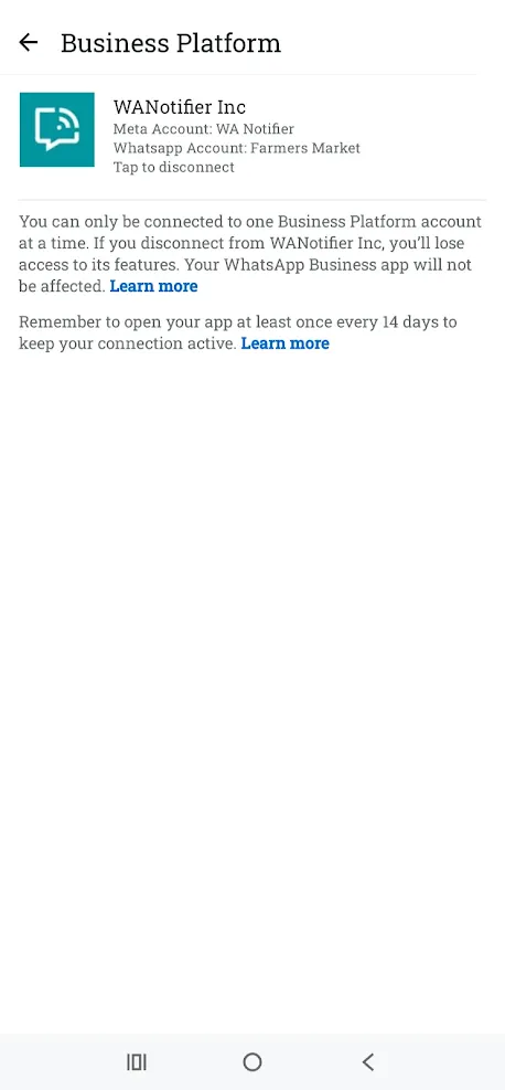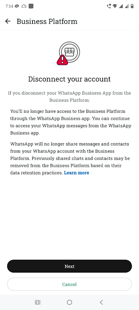 To do this, open the WhatsApp Business App, go to Settings › Account › Business Platform, and tap Disconnect Account.