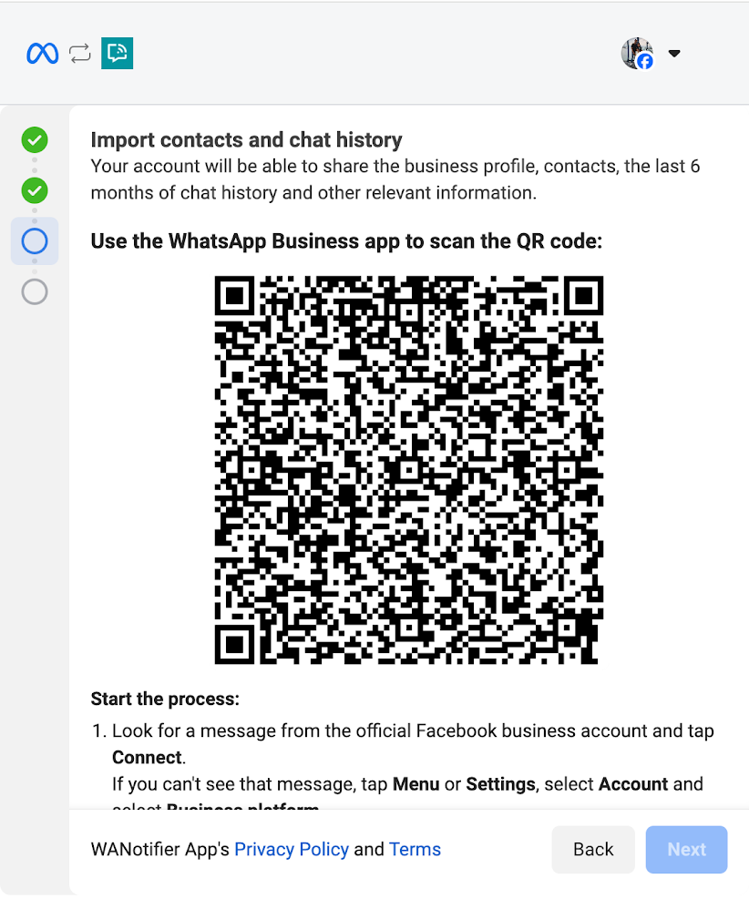 Once you’ve chosen an option and scanned your QR code, you can complete the remaining embedded signup flow. You will then be able to synchronize your contacts and up to the last 6 months of chats across both the WhatsApp Business App and the WhatsApp API seamlessly.