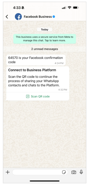 The message will prompt you to scan the QR code displayed in the Embedded Signup flow.