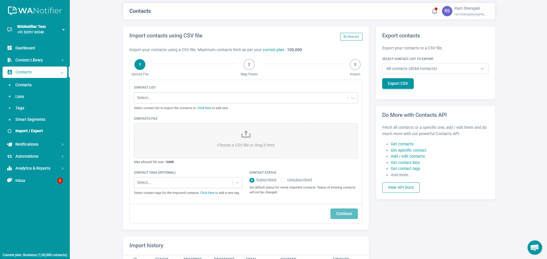 Here, you can import your contacts using a CSV or Excel file. Alternatively, you can import contacts using our Contacts API.