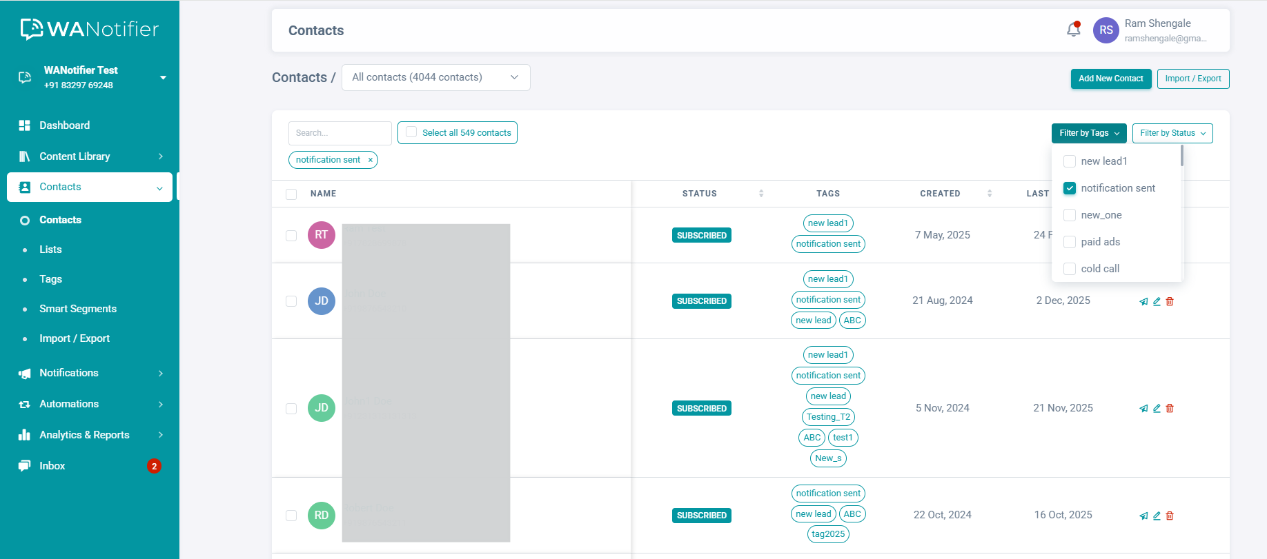 Once your contacts are uploaded, you can filter them by tags or by their status (subscribed or unsubscribed and saved or unsaved).