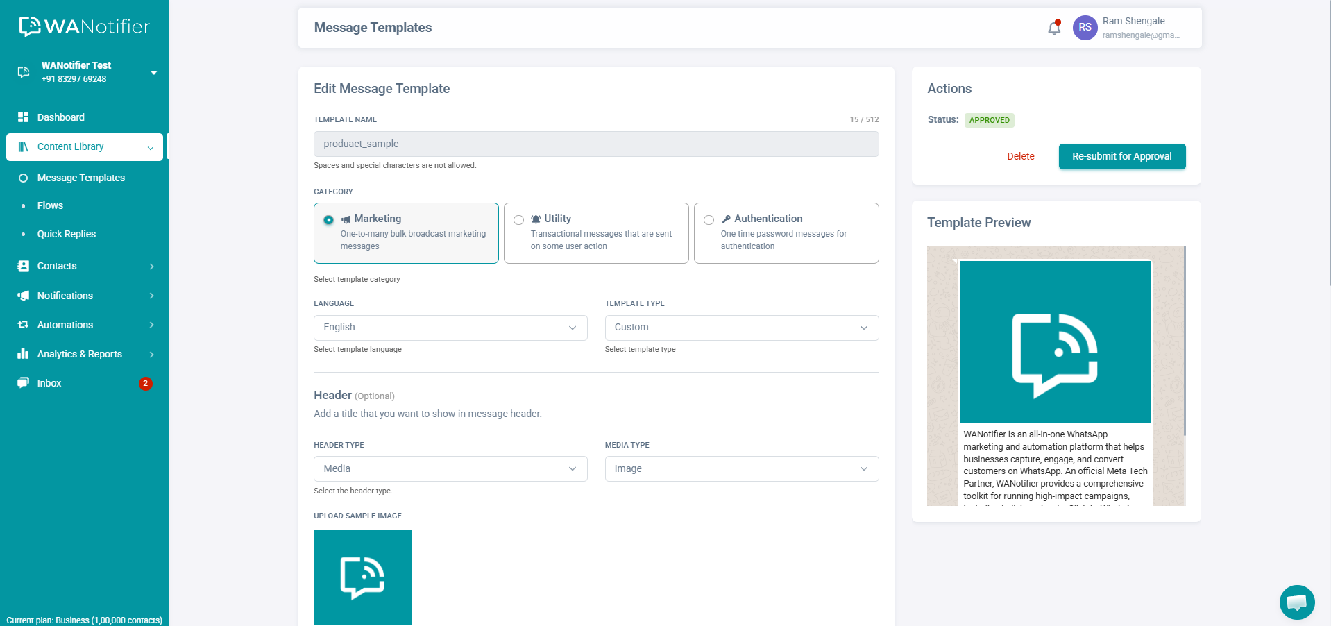 When you’re satisfied with the template, hit the submit button to send it for WhatsApp’s approval. Note that the review process typically takes anywhere between 30 minutes and 48 hours, and the template cannot be used in campaigns until it has been approved.