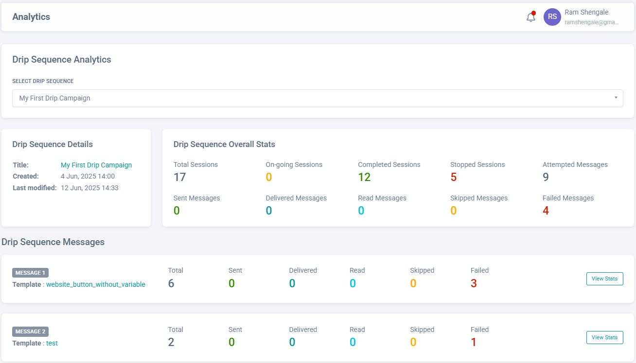 Once you’re here, select any drip sequence from the dropdown at the top. The dashboard will then show how many sessions of that sequence were started, completed, or stopped, along with the performance of individual messages within the sequence.