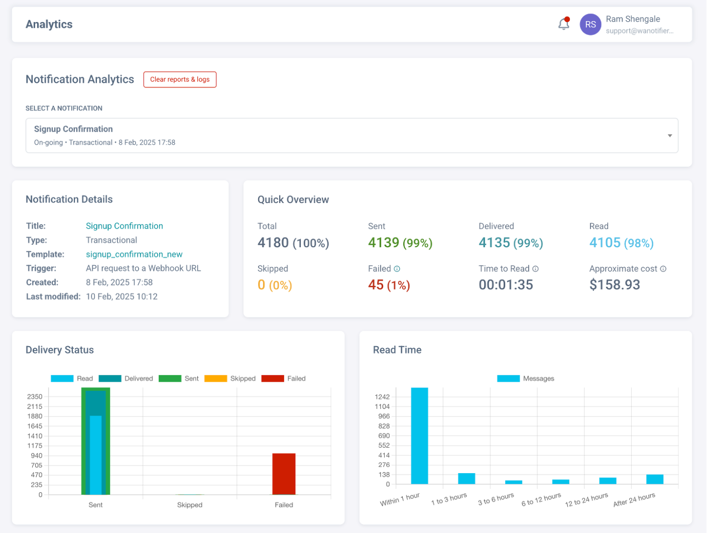 - Delivery Status: This shows how many messages were successfully delivered and read, and how many failed. You can also view detailed delivery reports and activity logs to understand why certain messages failed, along with their corresponding error codes.